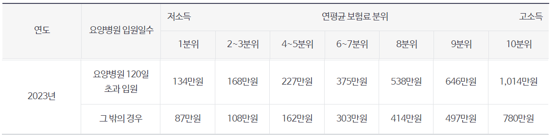 예를 들어 설명해 보겠습니다. 1분위에 해당되는 사람이 올해(2023년) 여러 병원에서 건강보험 본인부담금 550만 원을 부담했다면 (단, 요양병원 입원일수 120일 이하) 본인부담금 550만 원에서 본인부담상한액 87만 원을 뺀 463만 원을 사후환급금으로 받을 수 있다는 말입니다.