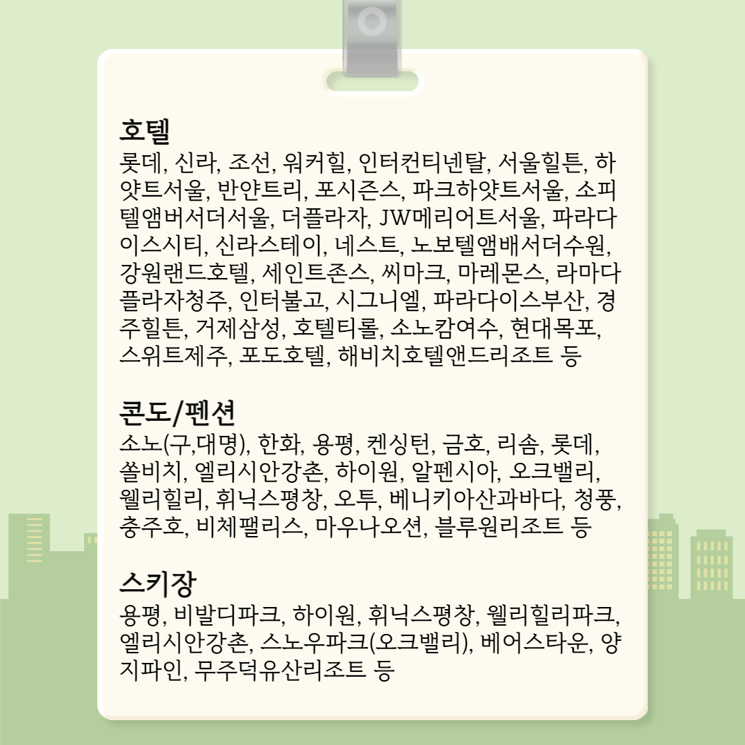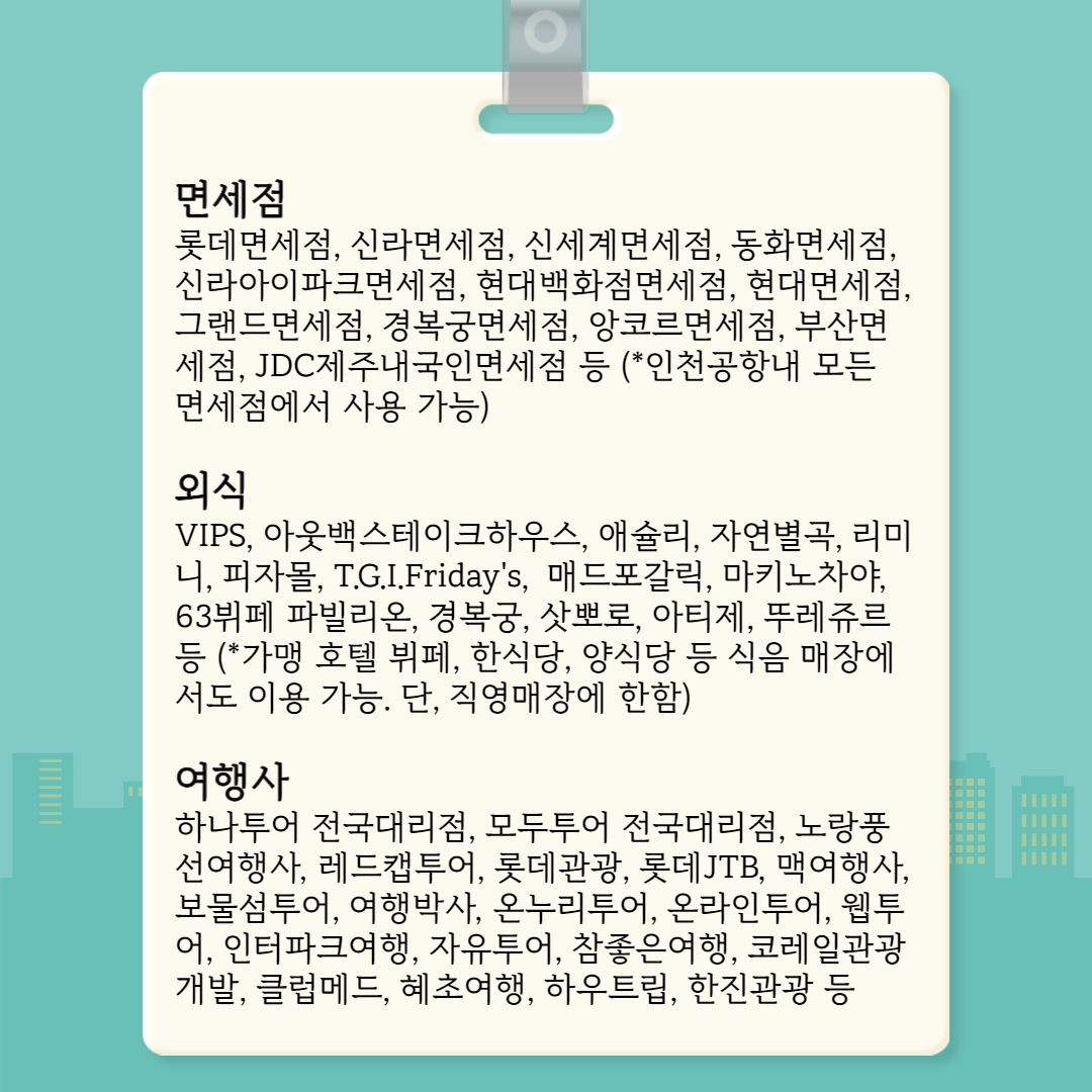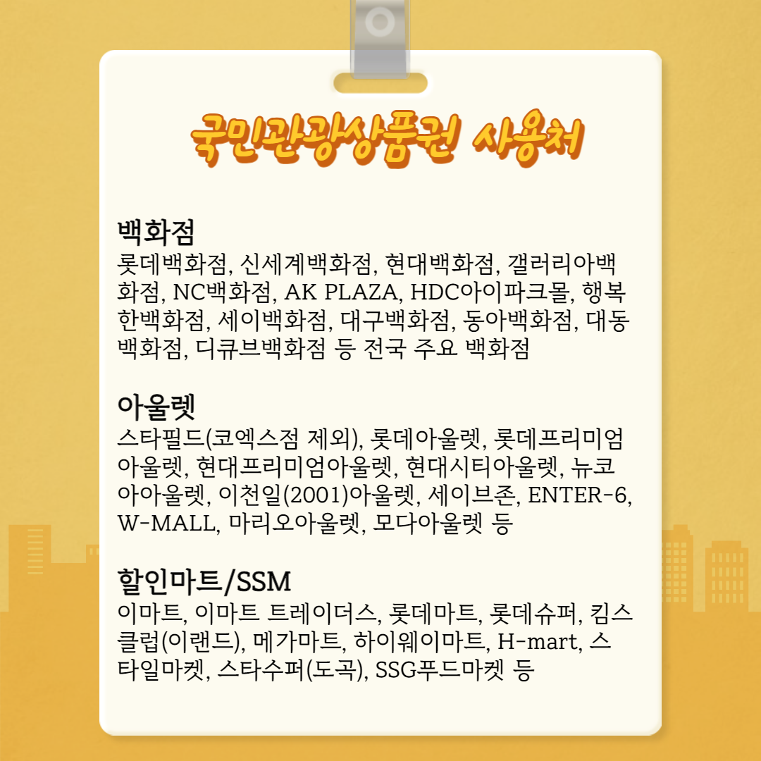 국민관광상품권 사용처는 크게 백화점, 아울렛, 마트, 면세점 등의 쇼핑분야와 호텔, 콘도, 펜션 등의 숙박, 여행사, 골프장, 스키장, 테마파크와 같은 레저, 그리고 외식분야 등 다양하게 있으며 업종별로 정리해봤습니다.