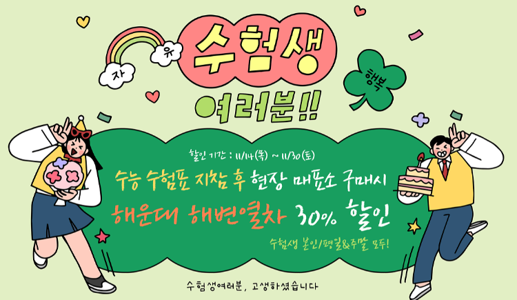 수능을 보느라 고생하신 수능생 분들에겐 좋은 소식도 있습니다. 바로 할인 이벤트입니다. 단, 현장 구매로 진행해야 할인을 받을 수 있다는 점 유의해 주세요! 이 할인 이벤트뿐만 아니라 다른 할인도 마찬가지로 현장 구매로만 할인을 받을 수 있습니다. 기간이 정해져 있으니 놓치지 마시고 꼭 할인받아서 예쁜 경치 누리시기 바랍니다. :)