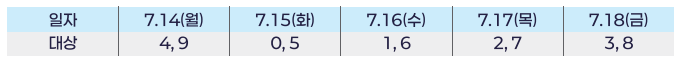 신청 기간 첫 주(7.14~18)는 5부제를 운영하므로 사업자 등록번호 끝자리에 따라 신청일이 다릅니다.
