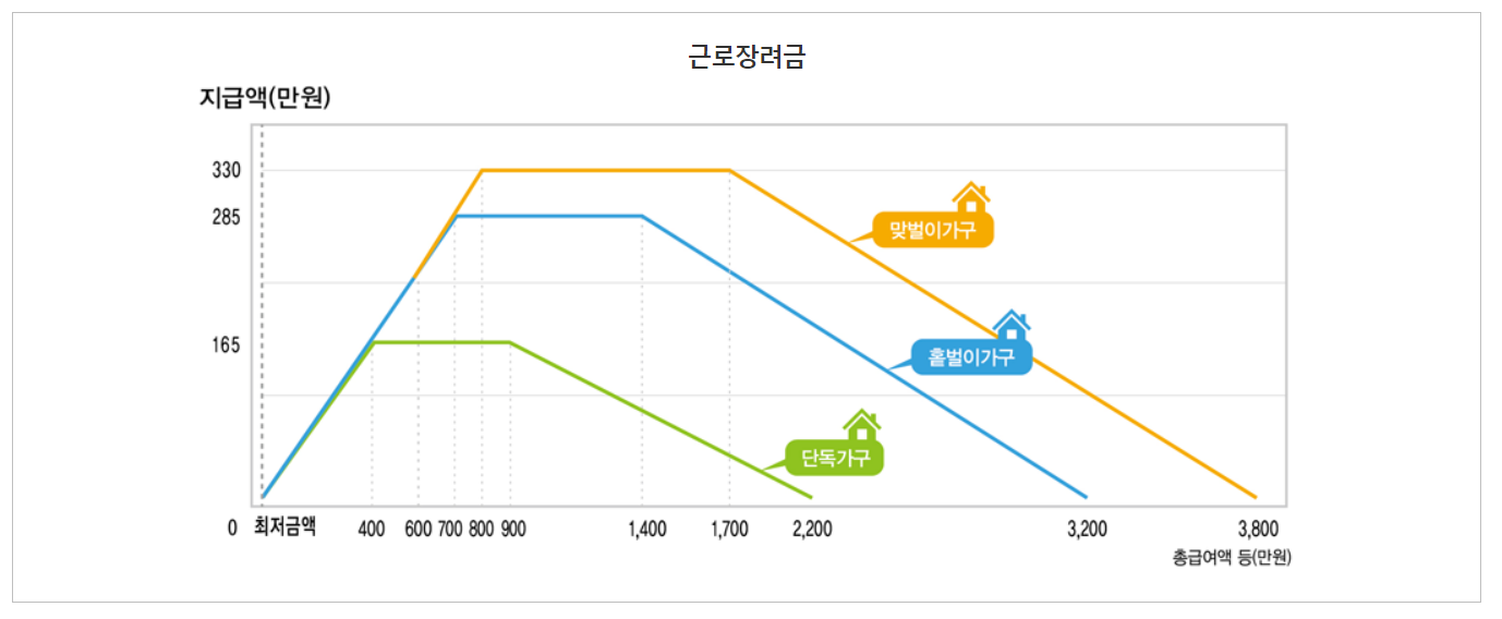 일은 하지만 소득이 적어 생활이 어려운 근로자나 사업자 가구에 대하여 기준에 따른 산정액을 지급함으로써 근로를 장려하는 제도입니다. 이때 사업자 중 전문직은 제외되며 가구원 구성과 근로소득, 사업소득 혹은 종교인소득에 따라 산정 후 현금으로 지급하여 실질소득을 지원합니다.
